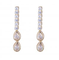 Χρυσά σκουλαρίκια κρεμαστά 14 Καρατίων με ιδιαίτερο μοντέρνο σχέδιο από μονή σειρά με ζιργκόν Swarovski η οποία συνεχίζει με σειρά 2 πετρών σε σχέδιο δάκρυ ζιργκόν Swarovski.