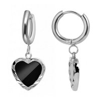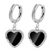 Ατσάλινα γυναικεία σκουλαρίκια κρίκοι με κρεμαστή καρδιά, σε ασημί και μαύρο χρώμα.
