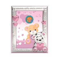 Ασημένια παιδική κορνίζα Slevori, με διακοσμητικό αρκουδάκι σε ροζ χρώμα.