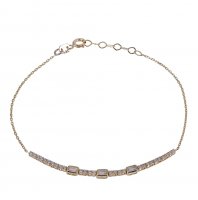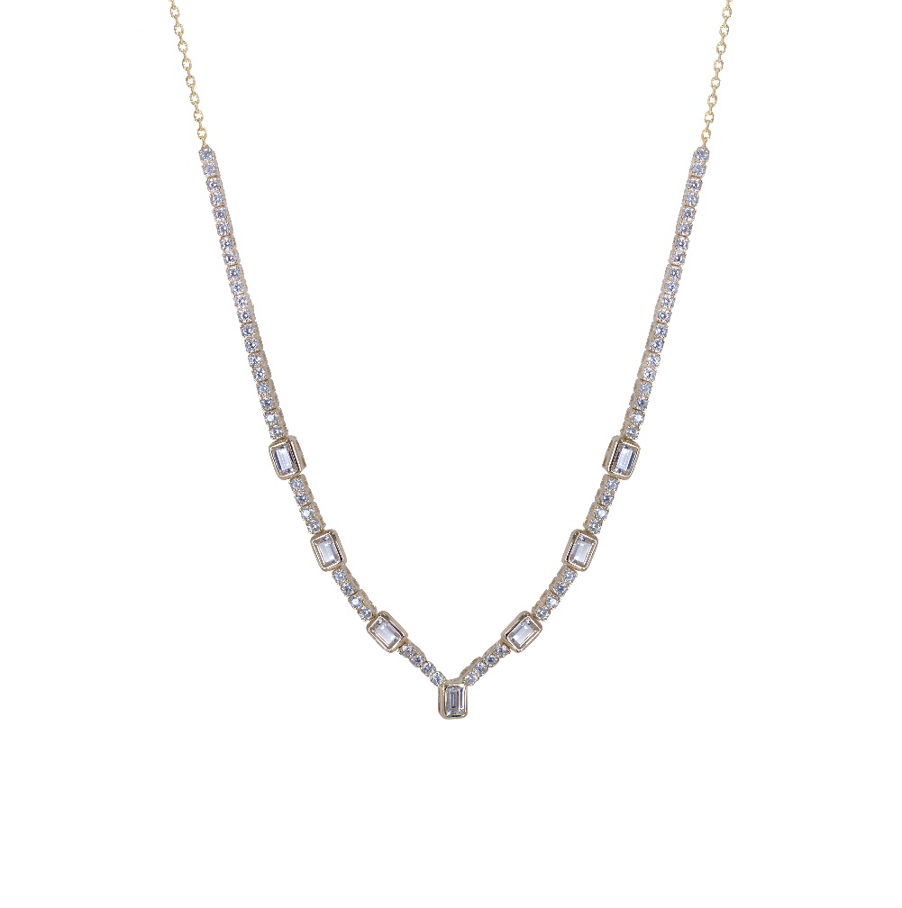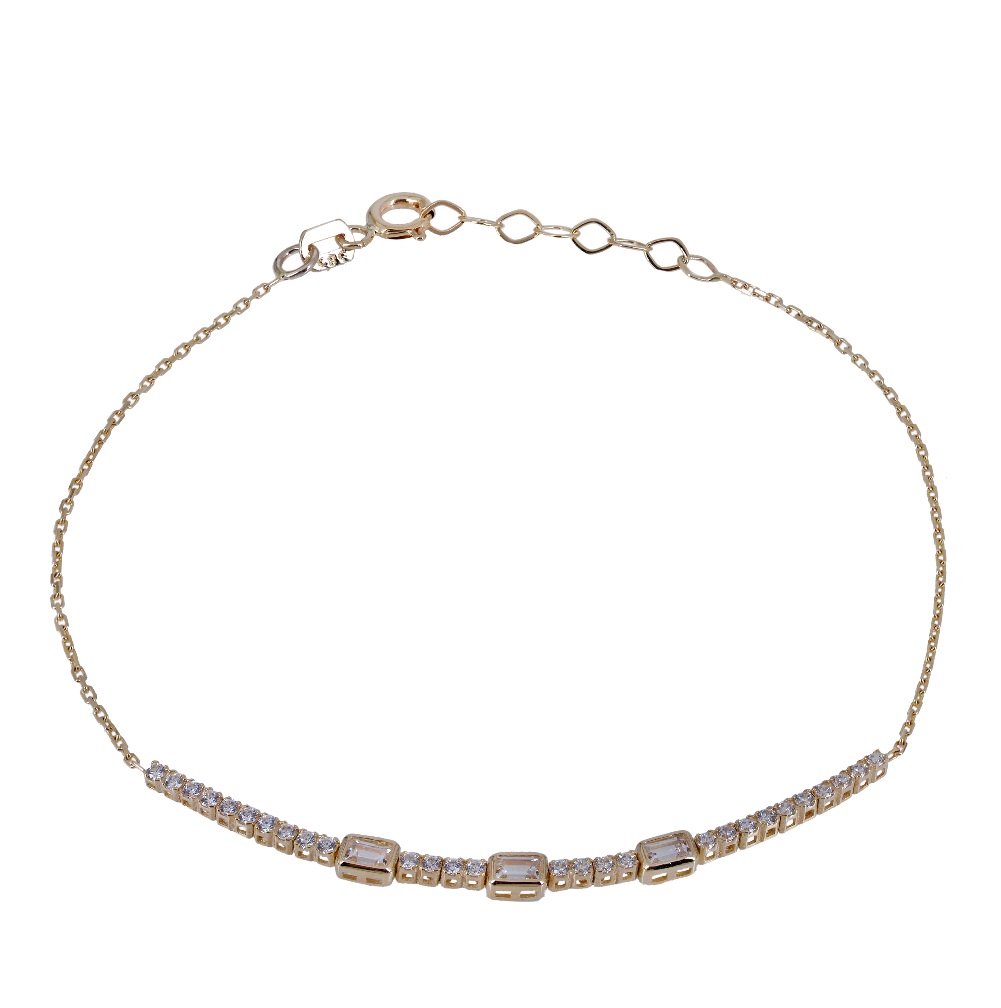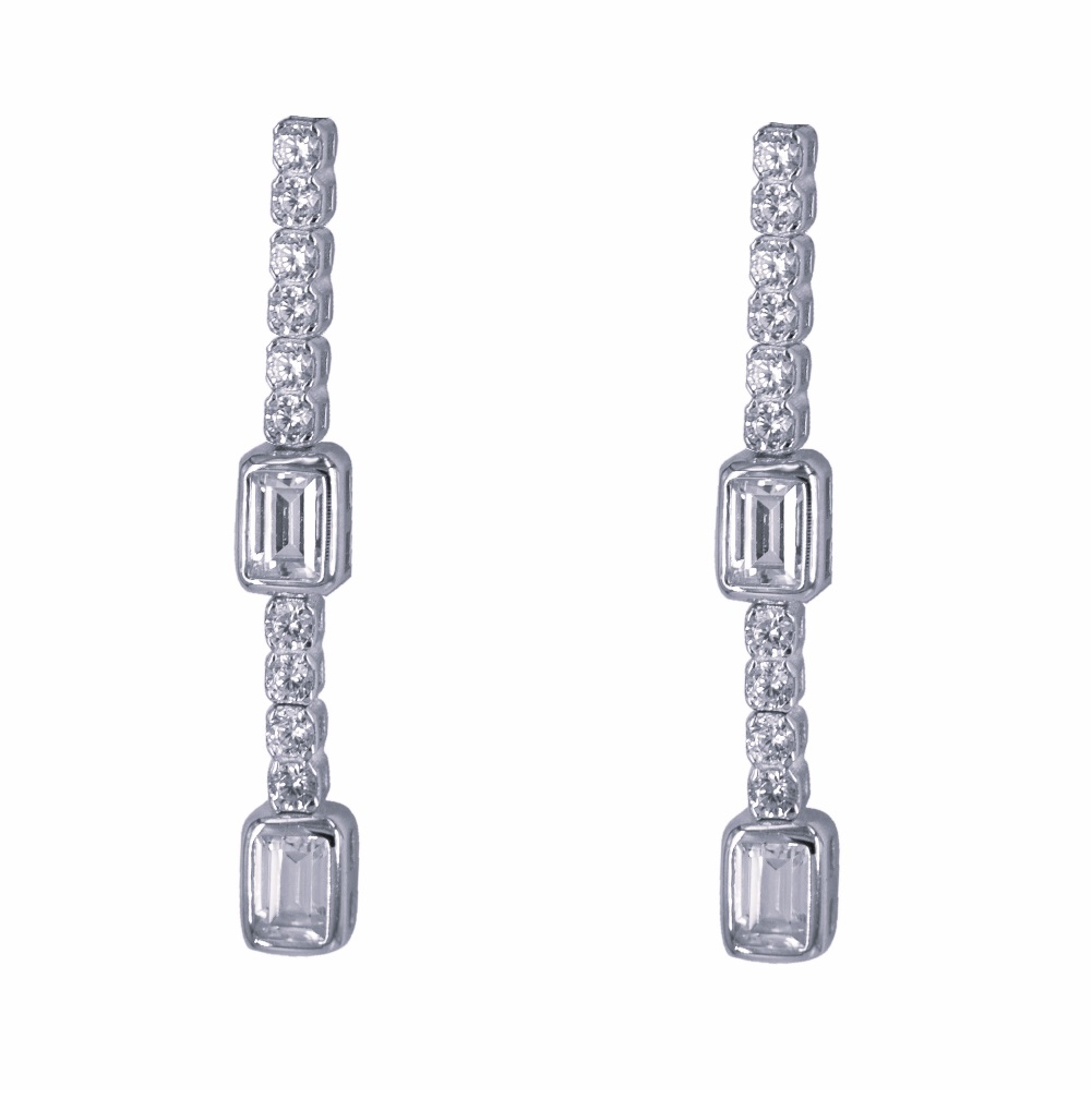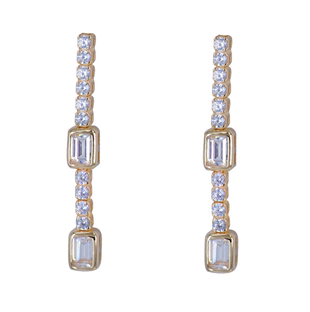 Χρυσά σκουλαρίκια κρεμαστά 14 Καρατίων με ιδιαίτερο μοντέρνο σχέδιο από μονή σειρά με ζιργκόν Swarovski με ενδιάμεσες πέτρες ζιργκόν Swarovski σε ορθογώνιο σχήμα .