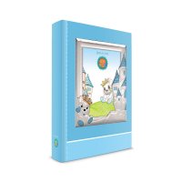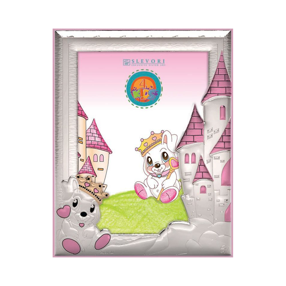 Ασημένια παιδική κορνίζα  με ασημένιο διακοσμητικό λαγουδάκι και κάστρο σε σιέλ χρώμα (και σε ροζ για κοριτσάκι) 925.