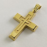 Ανδρικός Σταυρός δημιουργίας "Μενέκου", σε κίτρινο χρυσό 14 καρατίων, minimal γραμμής με ανάγλυφο σταυρό στο κέντρο. Γυαλιστερή σατινέ ματ υφή.