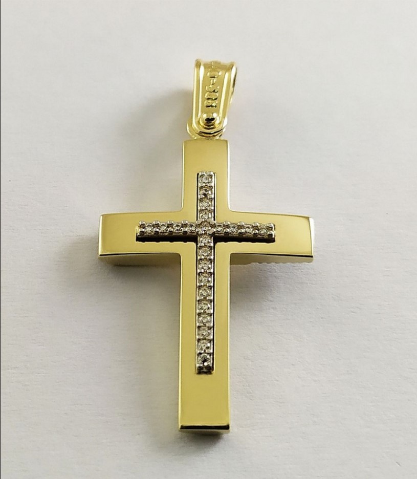 Ροζ χρυσός σταυρός 14 Καρατίων, γυναικείος, διπλής όψεως, με λευκές πέτρες ζιργκόν.
