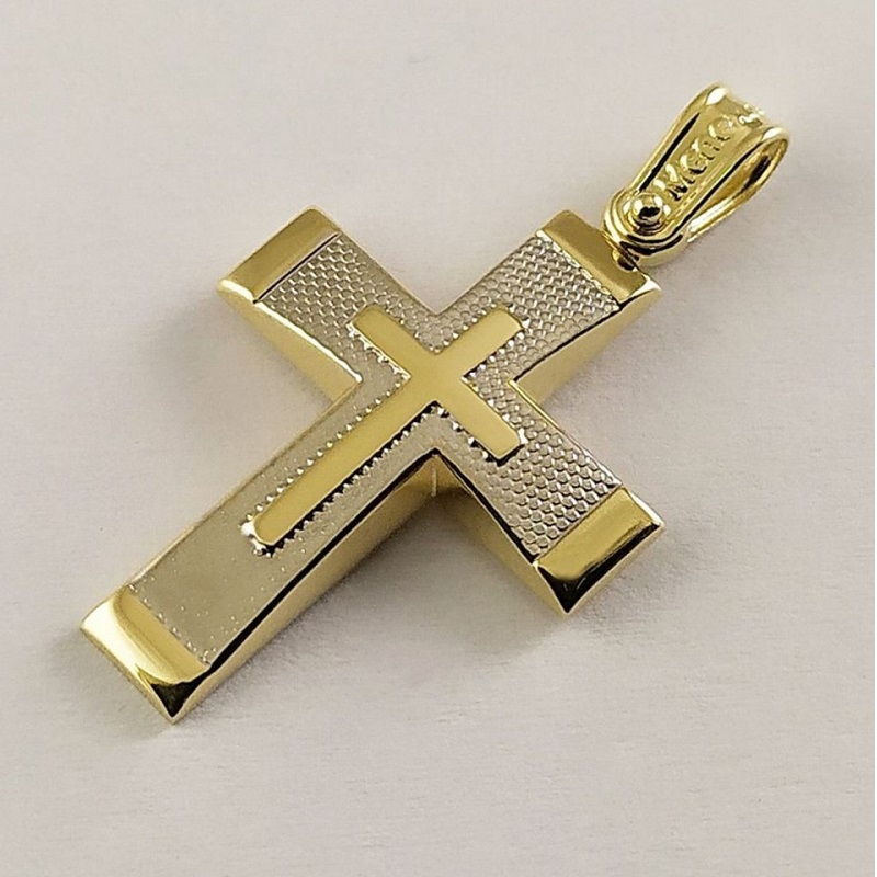 Ανδρικός Σταυρός δημιουργίας "Μενέκου", δίχρωμος, σε κίτρινο χρυσό 14 καρατίων, minimal γραμμής με ανάγλυφο σχέδιο σταυρού στο κέντρο. Γυαλιστερή, σατινέ και ματ υφή.