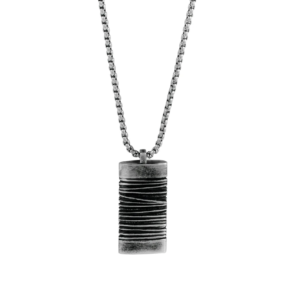 Ανδρικό ατσάλινο κολιέ με ορθογώνιο μενταγιόν με μαύρες λεπτομέρειες. Κατασκευασμένο από ανοξείδωτο ατσάλι υψηλής ποιότητας, σίγουρα θα εντυπωσιάσει όπου κι αν πάτε. Το κούμπωμα σε σχήμα αστακού εξασφαλίζει επιπλέον ένα ασφαλές και άνετο κούμπωμα, προσφέροντάς σας ηρεμία καθώς το φοράτε όλη την ημέρα.