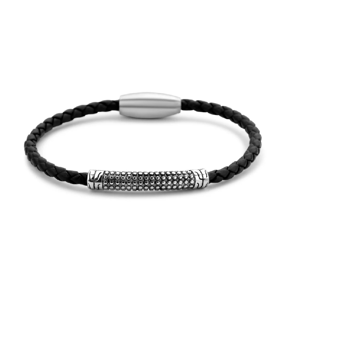 Ανδρικό δερμάτινο πλεκτό βραχιόλι κατασκευασμένο με ακρίβεια, αυτό το βραχιόλι από δέρμα και ατσάλι προσθέτει μια τολμηρή πινελιά στην εμφάνισή σας.