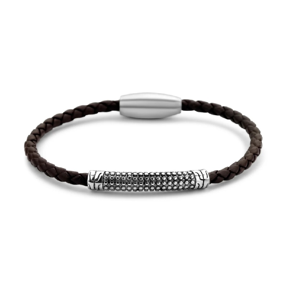 Ανδρικό βραχιόλι κατασκευασμένο από σκούρο καφέ πλεκτό δέρμα και διακοσμημένο με ένα στιβαρό και έντονο ατσάλινο στοιχείο, αυτό το αξεσουάρ αποπνέει μια στιβαρή γοητεία. Με κομψό σχεδιασμό συνδυάζει αβίαστα τη διαχρονική κομψότητα με τη σύγχρονη πινελιά.