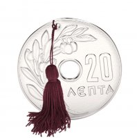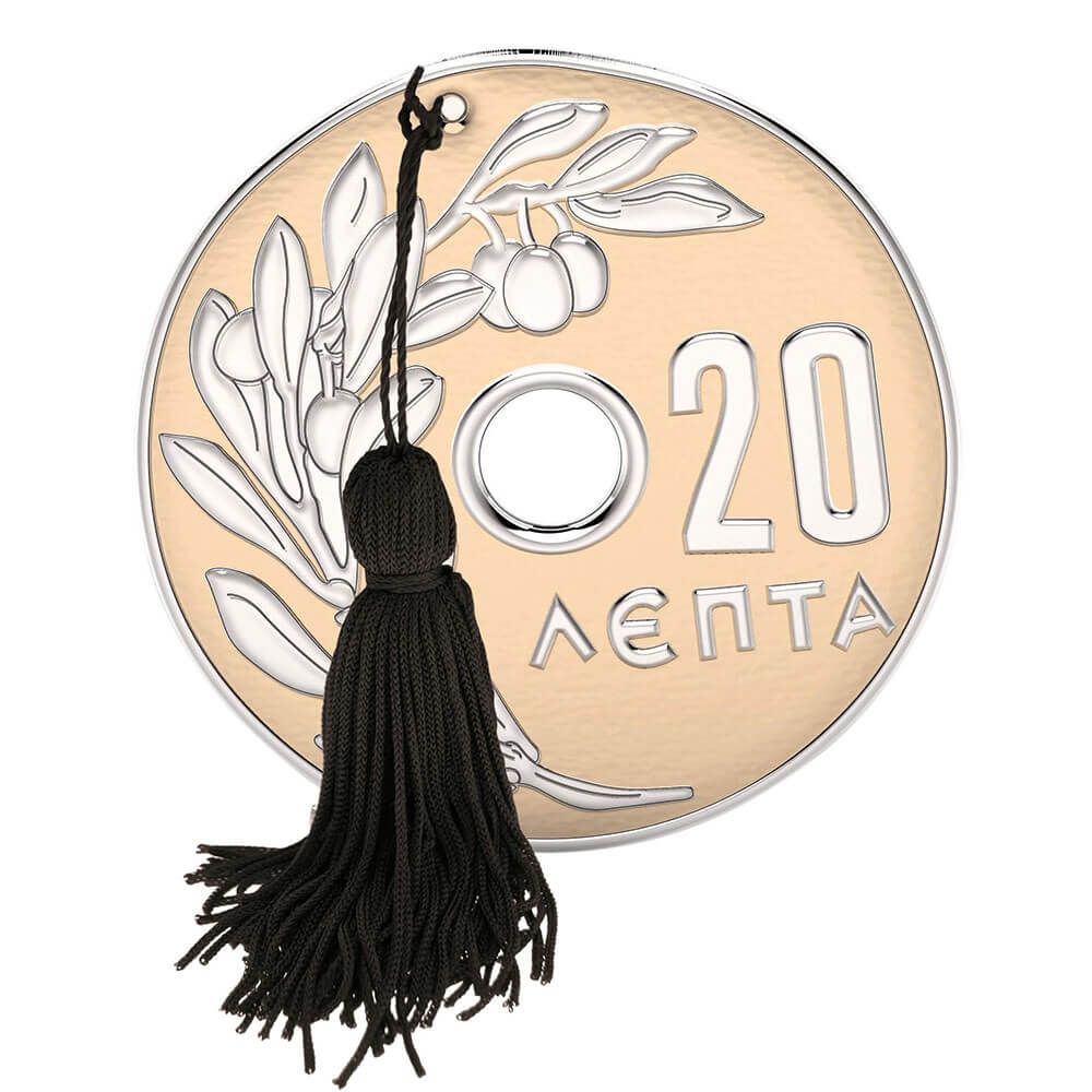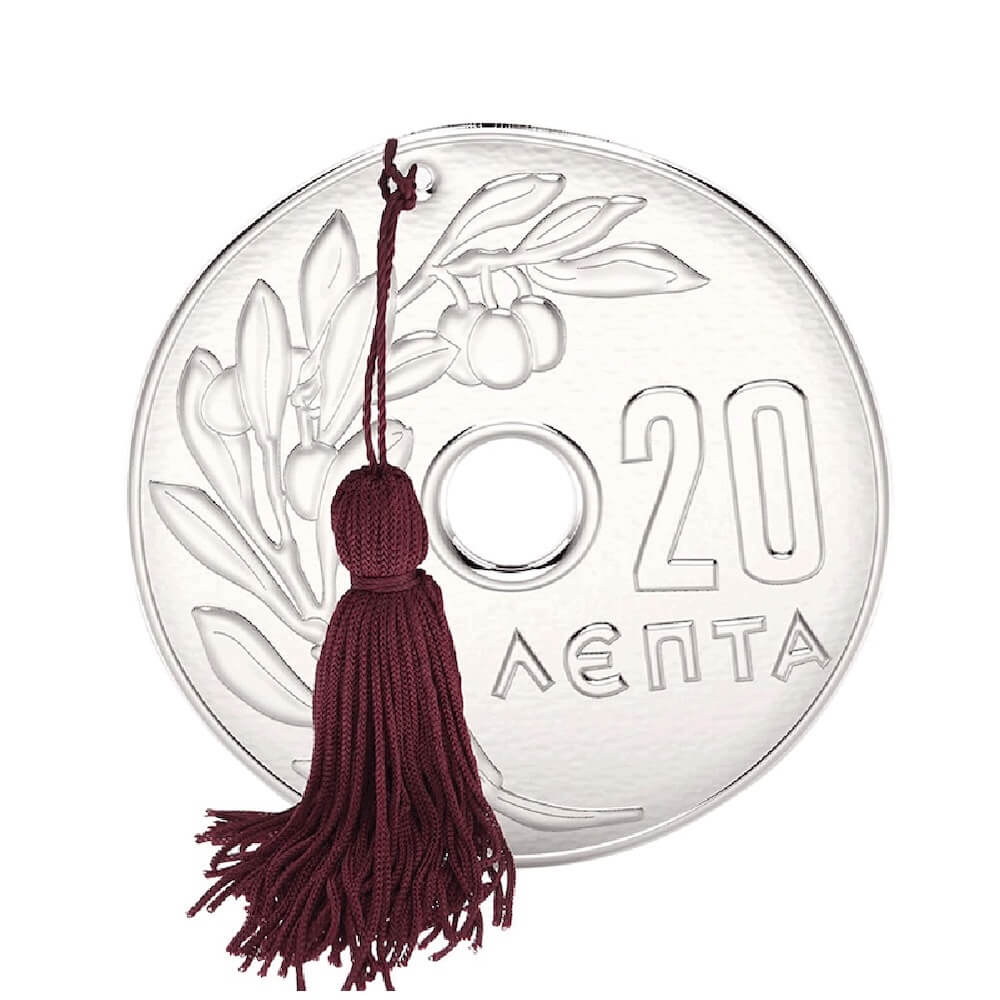 Γούρι επιτραπέζιο σε σχέδιο εικοσάρα - εικοσάλεπτης δραχμής με ένα κλαδί ελιάς. Σύμβολο ευημερίας, δύναμης και ελπίδας. Ιδανική επιλογή είτε για το σπίτι σας είτε για δώρο σε κάποιο αγαπημένο πρόσωπο.