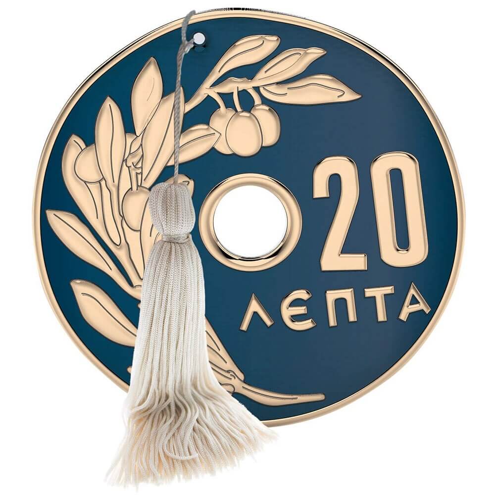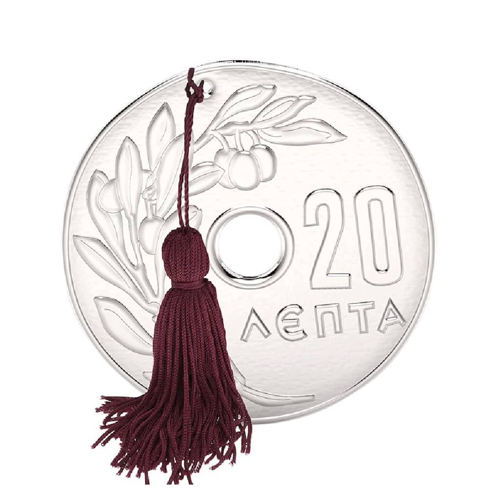 Γούρι επιτραπέζιο σε σχέδιο εικοσάρα (20 λεπτά της Δραχμής) και λευκή ξύλινη πλάτη.