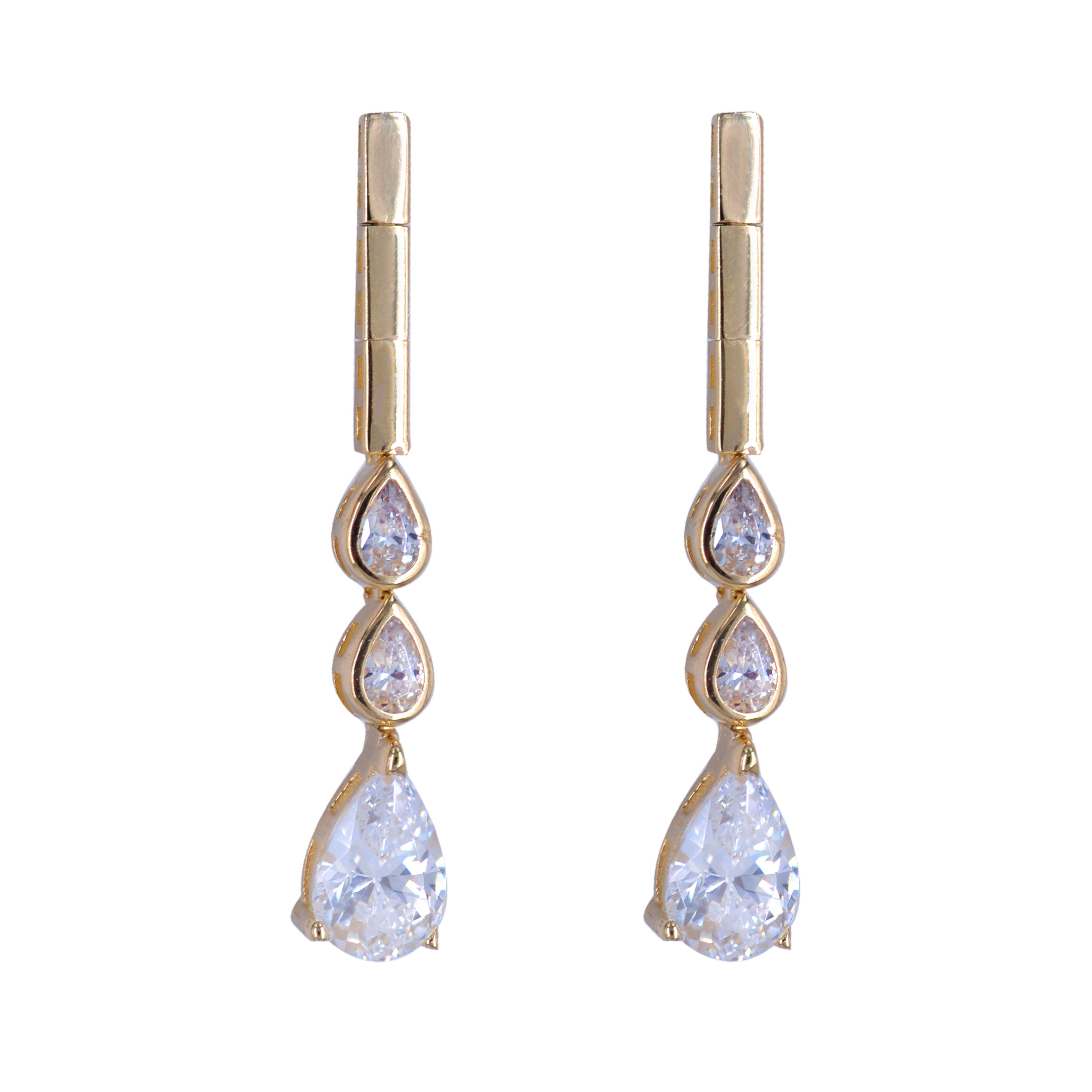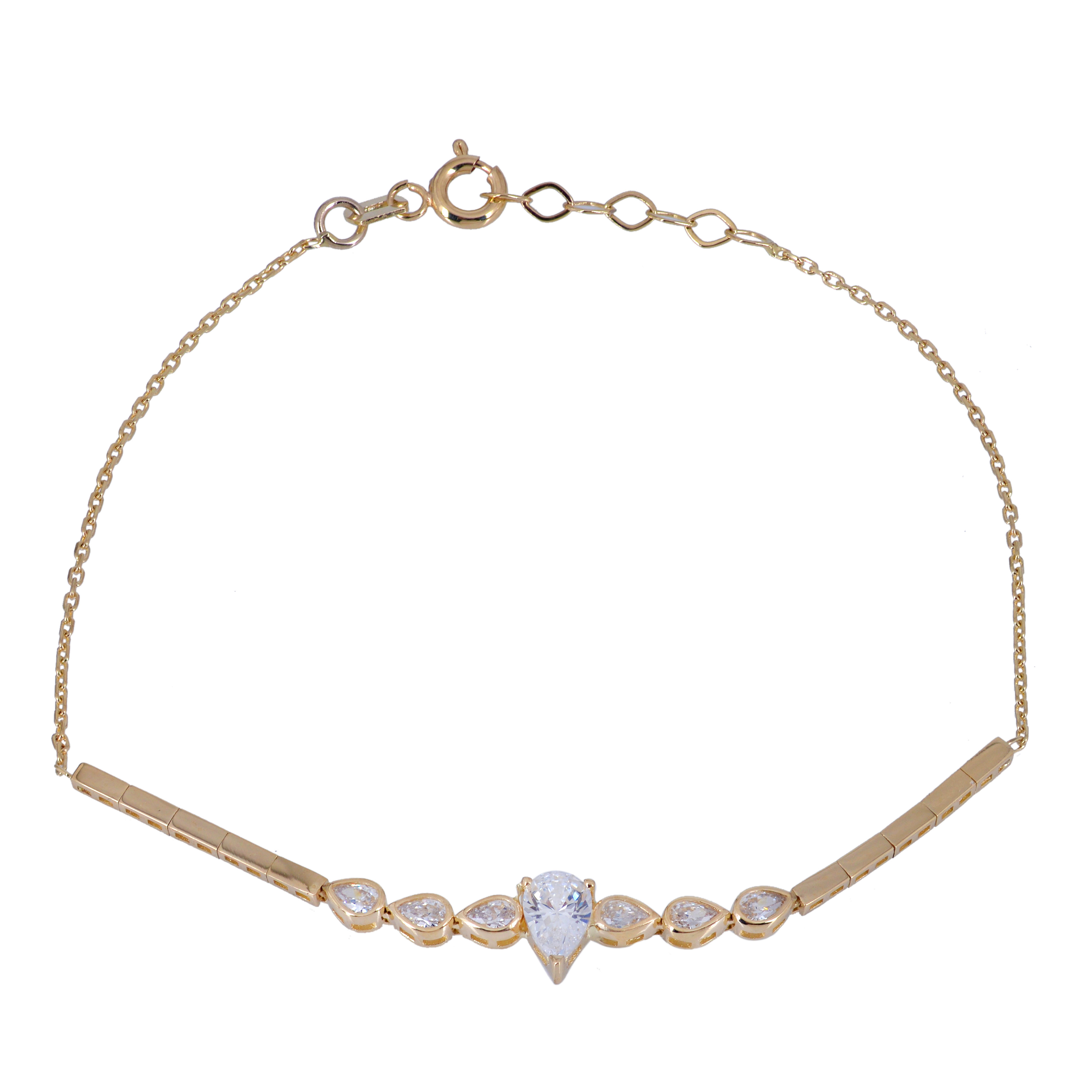 Xρυσό βραχιόλι 14 Καρατίων διακοσμημένο από λουστρέ ορθογώνια σχέδια και μία κεντρική πέτρα ζιργκόν Swarovski σε σχήμα δάκρυ που περιτρυγυρίζεται από 3 μικρότερες πέτρες ζιργκόν Swarovski σε κάθε μεριά.
